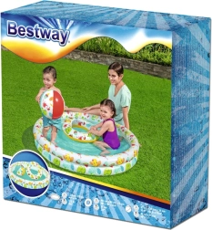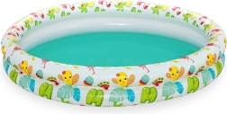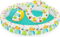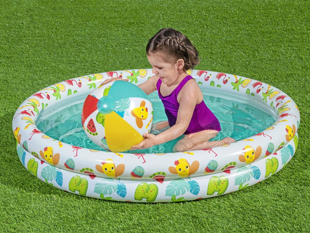 Лятно забавление в градината за миг! Този комплект 3в1 от BESTWAY комбинира надуваем басейн с диаметър 122 cm, пояс за плуване и плажна топка с весели тропически мотиви. Здравият винил, двойните въздушни камери и лесната преносимост гарантират безопасно и игриво освежаване за най-малките.