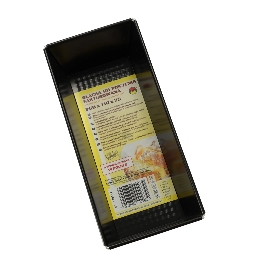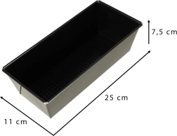 Практична форма за печене на хляб и кекс с размери 25 × 11 × 7,5 см, изработена от издръжлива нисковъглеродна стомана с незалепващо покритие и текстурирано дъно за лесно изваждане и равномерно изпичане. Подходяща за газови и електрически фурни, идеална за ежедневна употреба.