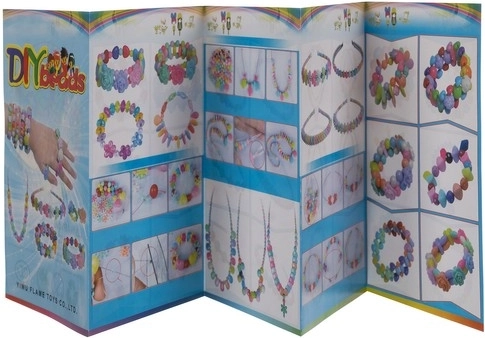 Цветна брошура с инструкции за изработка на колиета и гривни, която показва на децата различни модели.