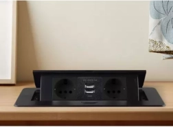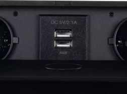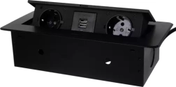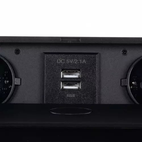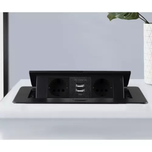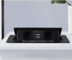 Осигурете си чист и безопасен достъп до захранване точно там, където е необходимо. Тази вградена разклонителна лайсна комбинира 2 мрежови контакта Schuko и 2 USB порта 5V/2,1 A в компактна конструкция, която елегантно се скрива в плота на бюро или работна повърхност. С натискане на бутон панелът се издига плавно над нивото на плота, а след употреба лесно се прибира.