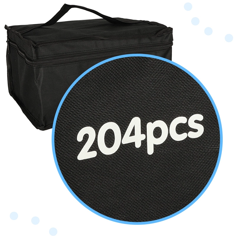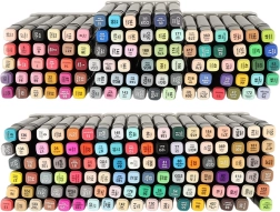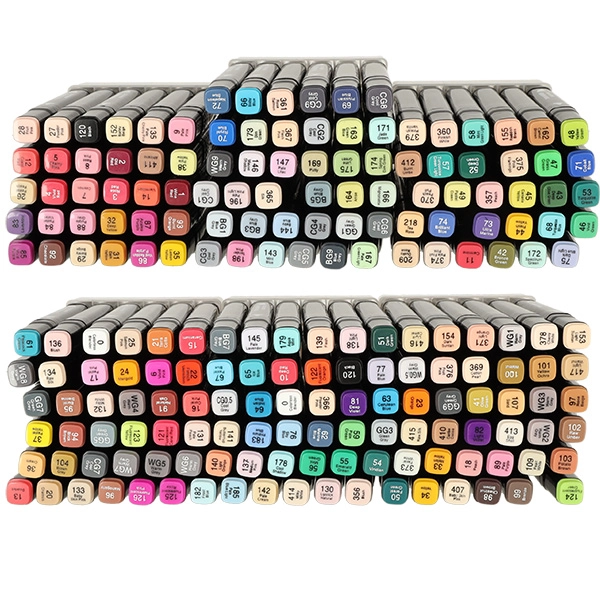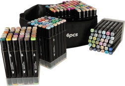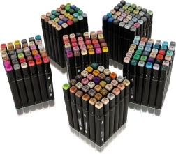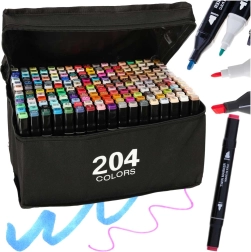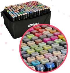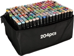 Професионалният комплект съдържа 204 двувърхи алкохолни маркера в практичен калъф и със стойка за подредено съхранение. Предлагат интензивни цветове, бързосъхнещо мастило и два върха за запълване на площи и фини детайли – идеални за илюстратори, дизайнери и хоби творчество.