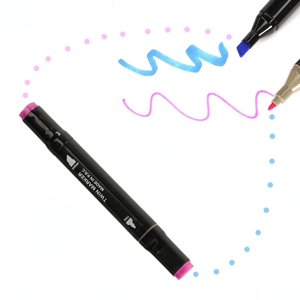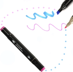 Всеки маркер има два върха – широк за бързо запълване на по-големи площи и тънък за прецизни линии и детайли. Практичната стойка държи цветовете под ръка и подредени, а калъфът с цип улеснява пренасянето на целия комплект.
