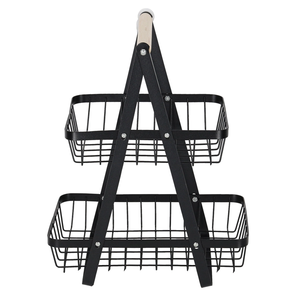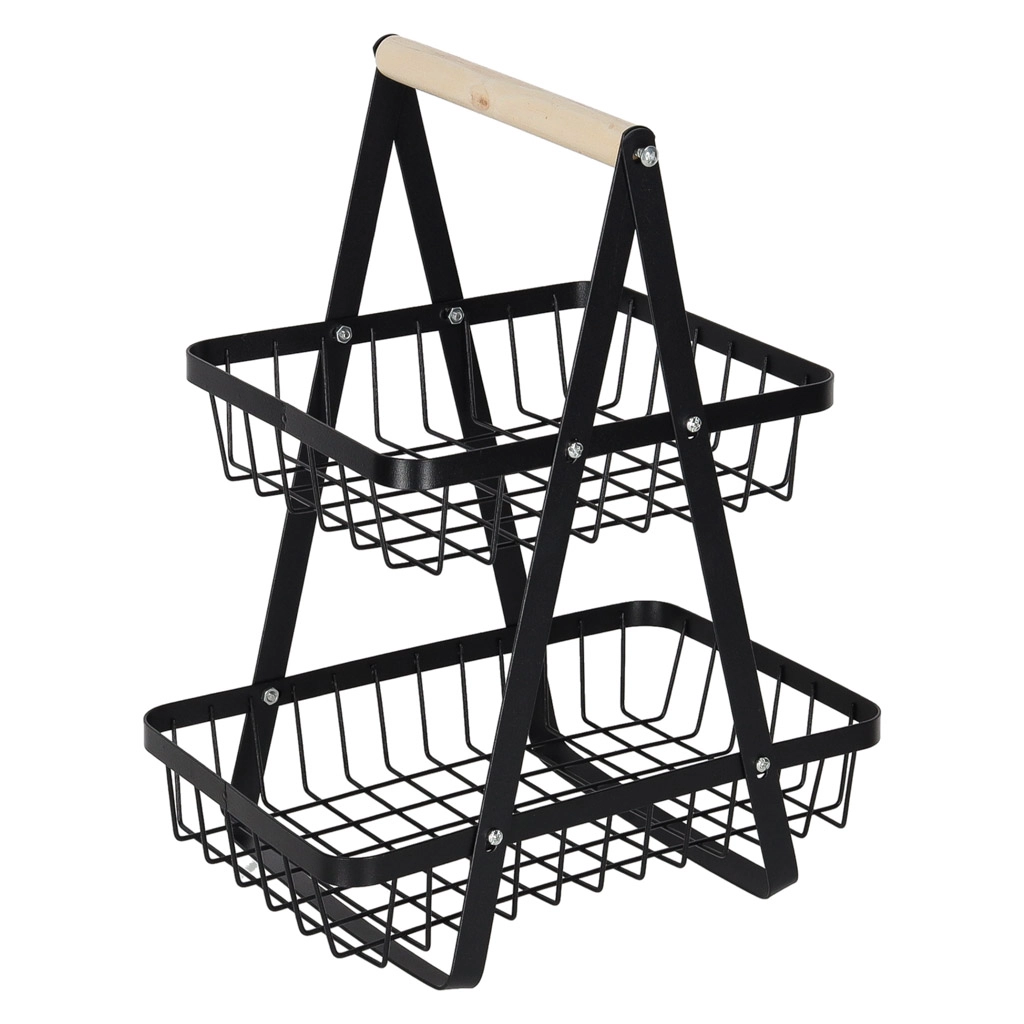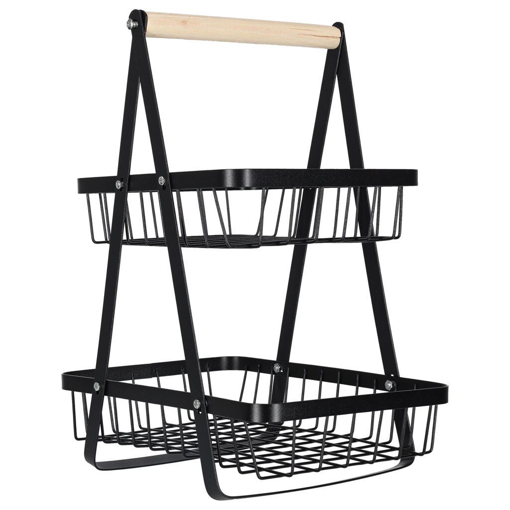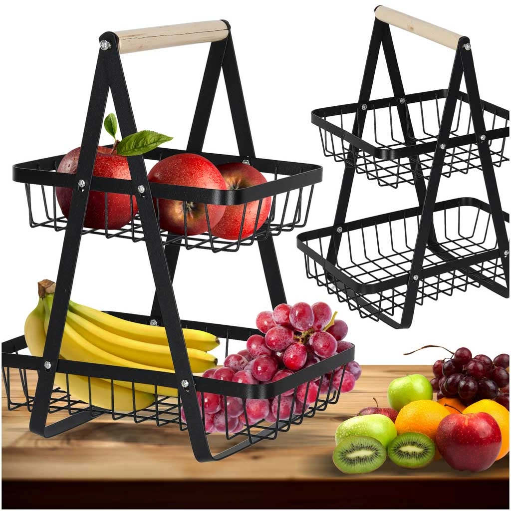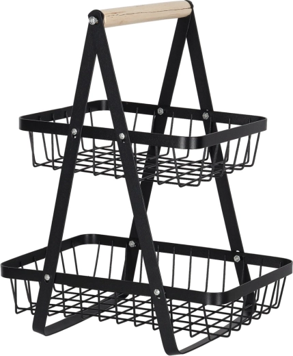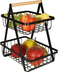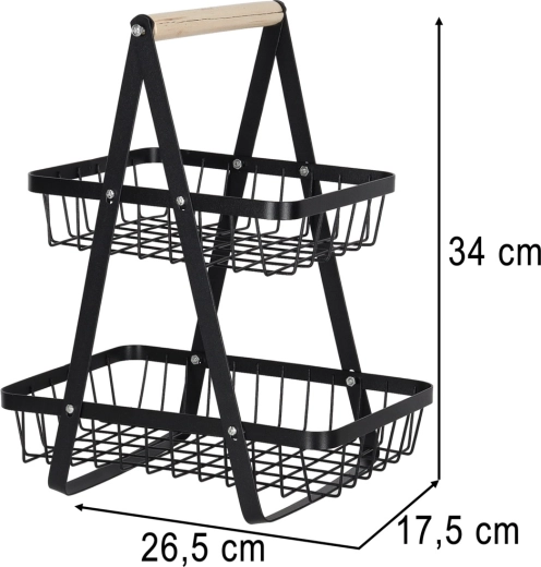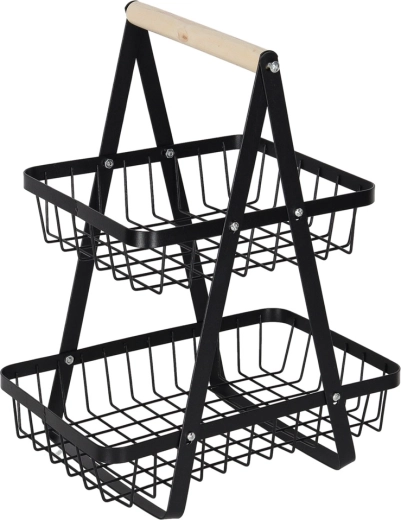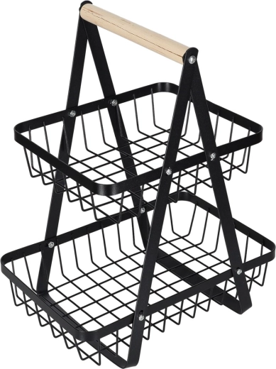 Дървената дръжка позволява лесно пренасяне навсякъде, където е необходимо. По-голямата долна кошница е подходяща за ябълки, портокали или зеленчуци, а по-малката горна – за банани, цитруси или дребни продукти. Издръжливата метална конструкция гарантира стабилност и дълъг живот.