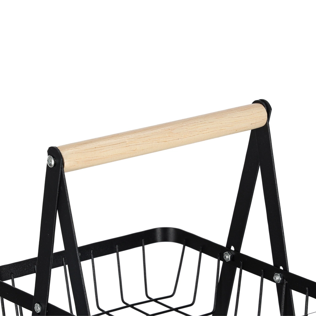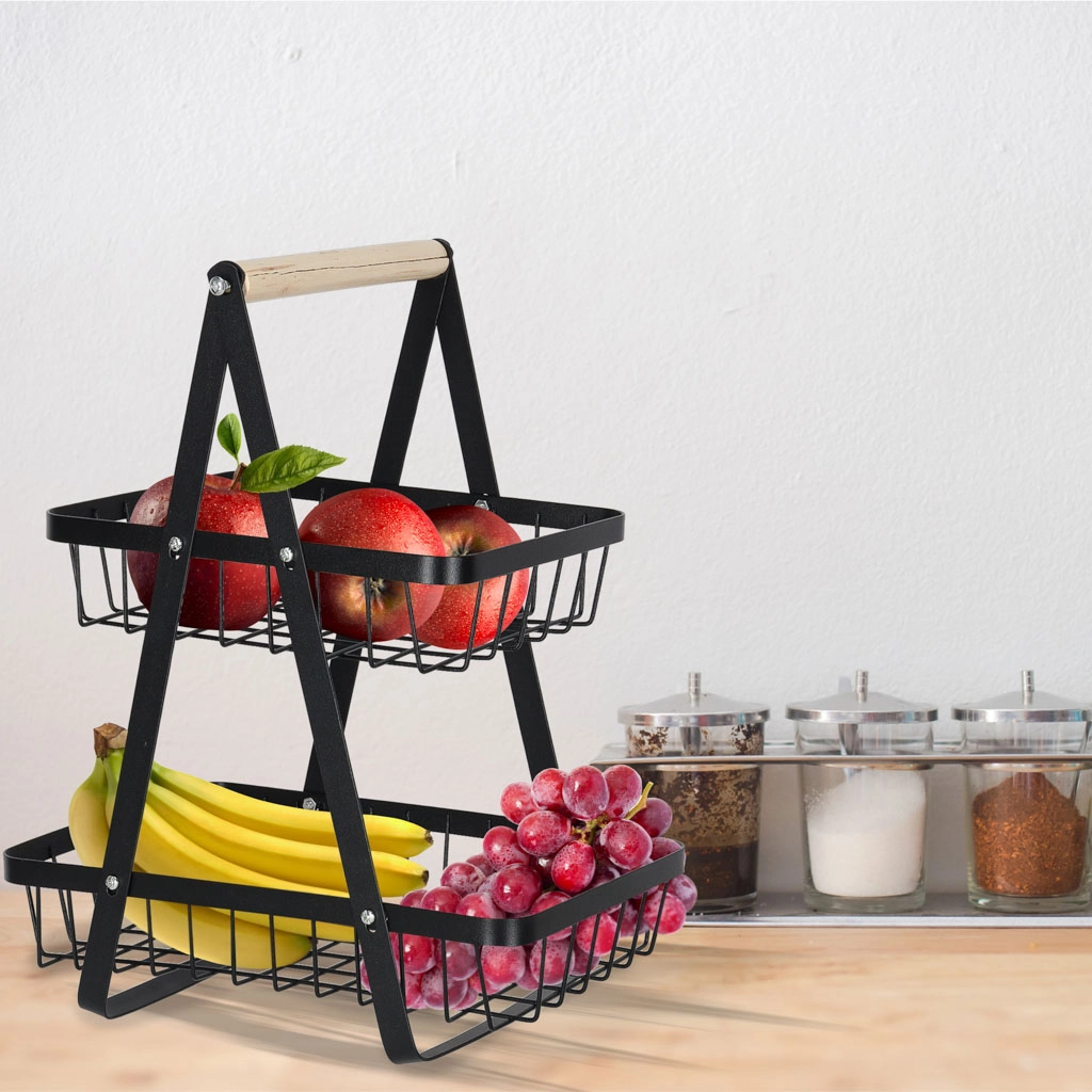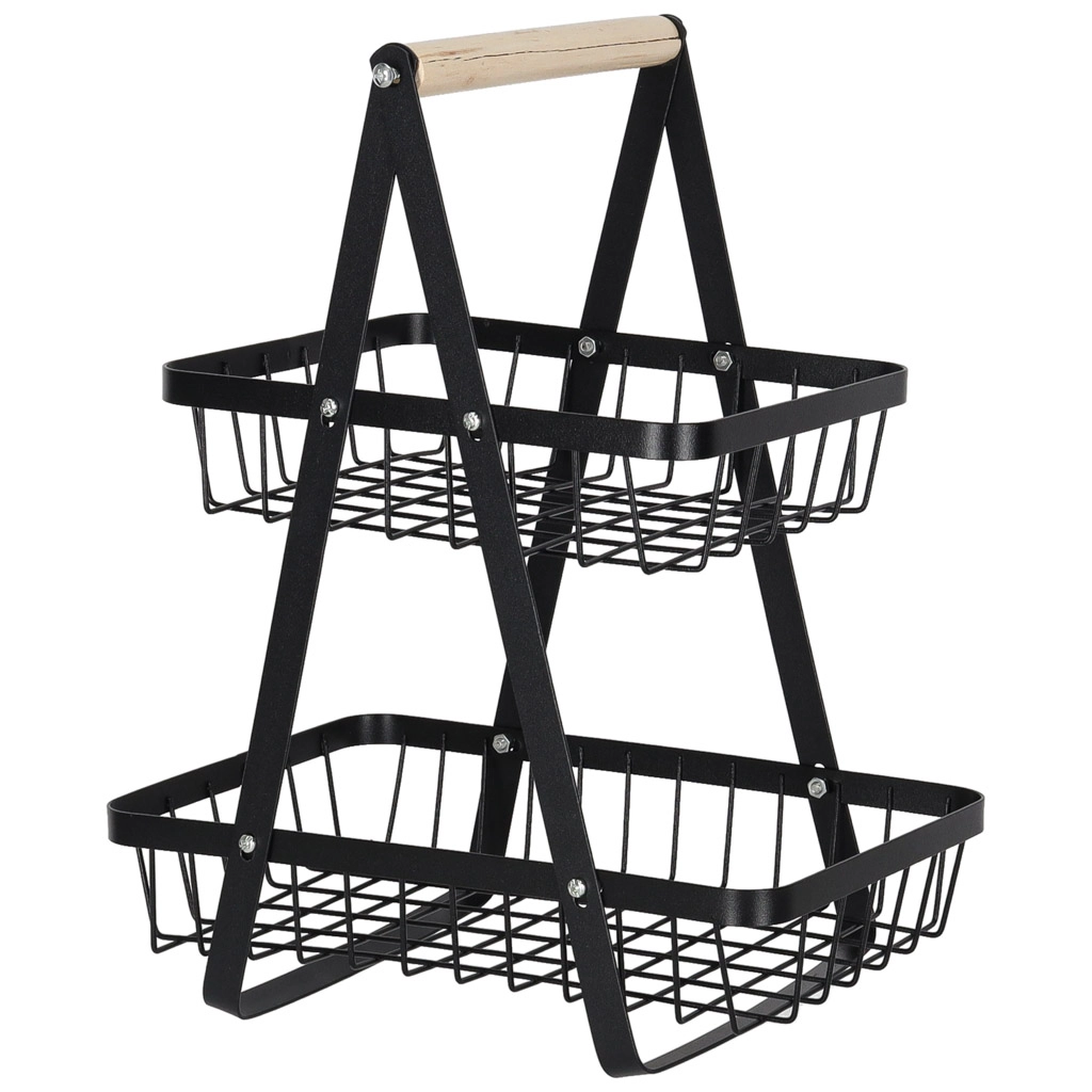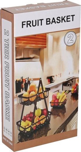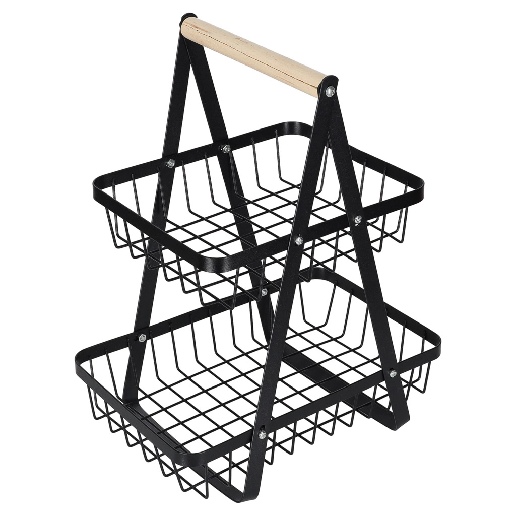 Дървената дръжка позволява лесно пренасяне навсякъде, където е необходимо. По-голямата долна кошница е подходяща за ябълки, портокали или зеленчуци, а по-малката горна – за банани, цитруси или дребни продукти. Издръжливата метална конструкция гарантира стабилност и дълъг живот.