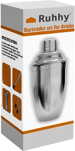 Този сет включва: шейкър с вместимост 700 ml, баров джигър (Jigger) 15/30 ml, барова лъжица, бармански мадлър (Muddler) и 2 наливника. Шейкърът е оборудван с вградено сито, което позволява да отделите коктейла от остатъците от съставките.