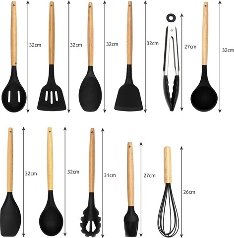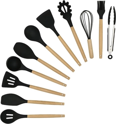 Комплектът кухненски инструменти на марката Ruhhy включва 12 разнообразни уреда, включително шпатула, черпаци и четка, всички с ергономични дървени дръжки и издръжливи силиконови глави. Тези инструменти са устойчиви на високи температури, лесни за почистване и предотвратяват надраскване на вашите съдове и прибори за готвене.