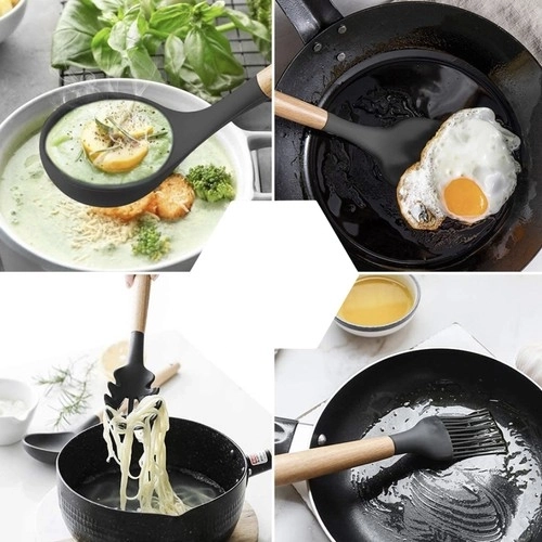 Обогатете своята кухня с нашия силиконов комплект кухненски инструменти. Този комплект е идеален за безопасно готвене върху тефлонови или други незалепващи повърхности. Силиконът издържа на високи температури до 230 градуса и не уврежда повърхността на вашите тигани и тенджери.