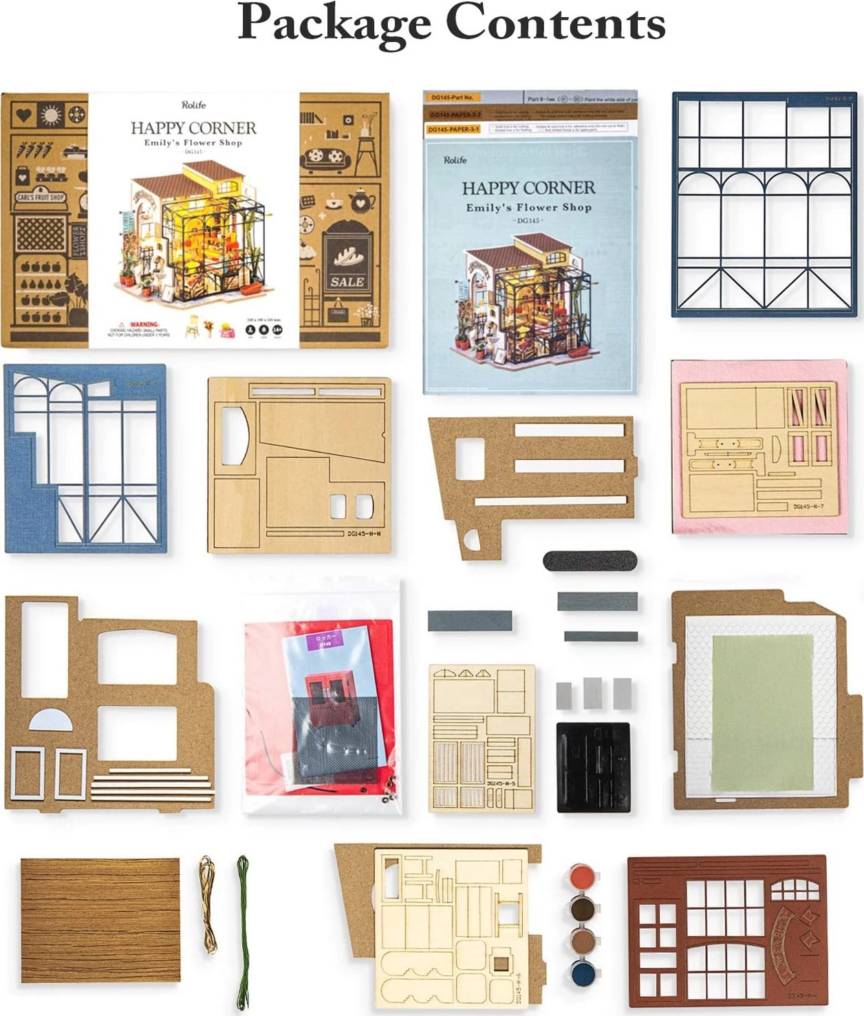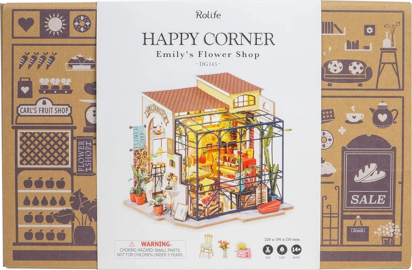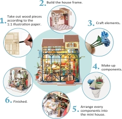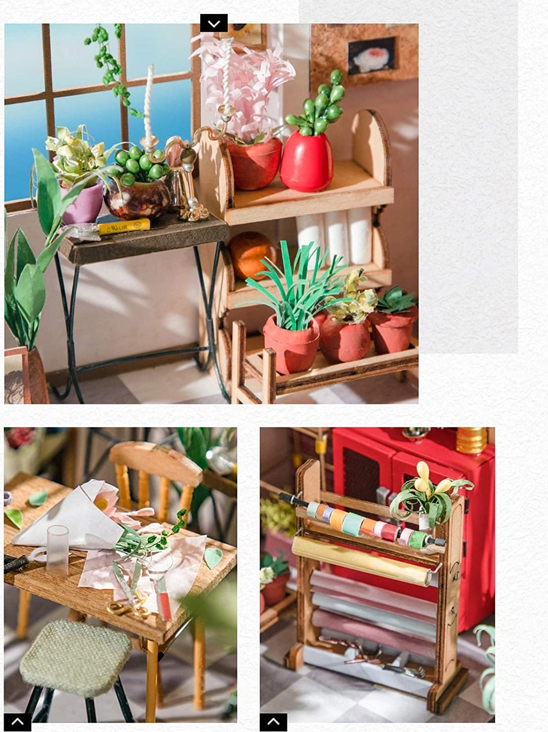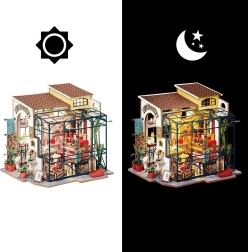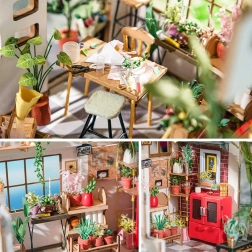 Създайте свой собствен живописен цветарски магазин с прилежаща оранжерия и множество растения, рафтове и гравирани аксесоари. Комплектът включва предварително изрязани части от шперплат, хартиени и текстилни елементи и набор от инструменти, с които се получава реалистичен модел с надпис „Flower Shop“ и прозрачна стъклена част. След сглобяване служи като стилна декорация за вашия интериор.