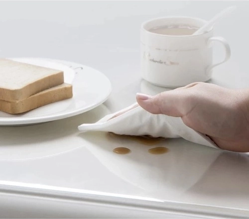 Подложката е напълно прозрачна и изглежда като стъклен слой, като същевременно предпазва повърхностите от драскотини и разливи.
