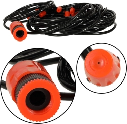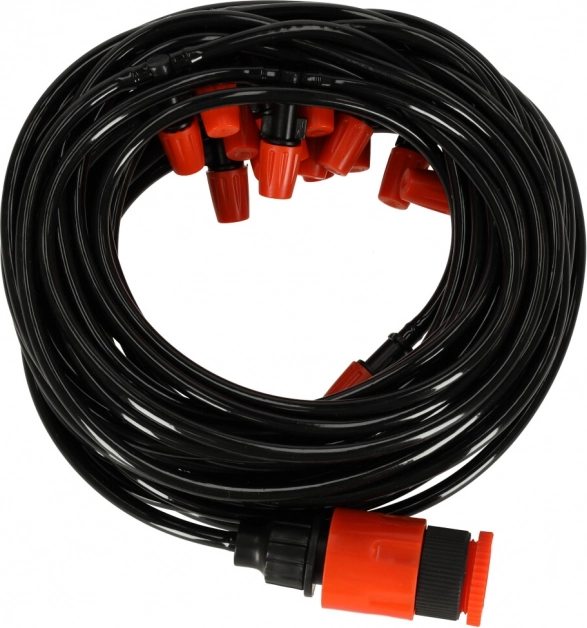 Маркучът лесно се свързва към стандартен градински маркуч или директно към кран. Регулирането на дебита на дюзите позволява да приспособите интензитета на мъглата към различни места. Благодарение на възможността за скъсяване на маркуча, настройвате разстоянието между дюзите според нуждите си и насочвате водата там, където е най-нужно.