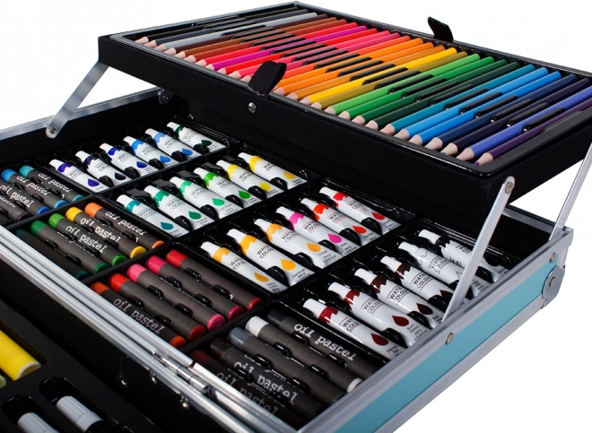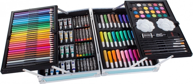 Комплектът включва широка гама от маслени пастели, флумастери, акварелни бои и други полезни инструменти.