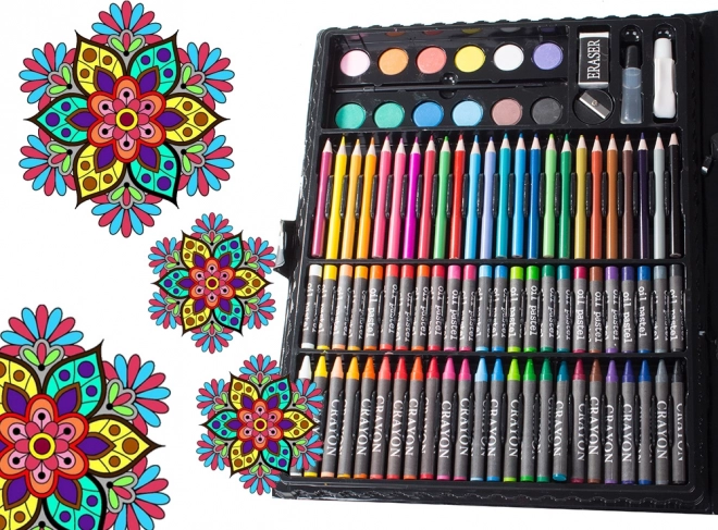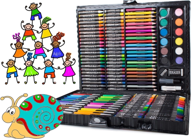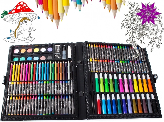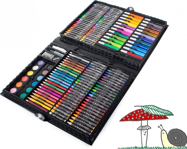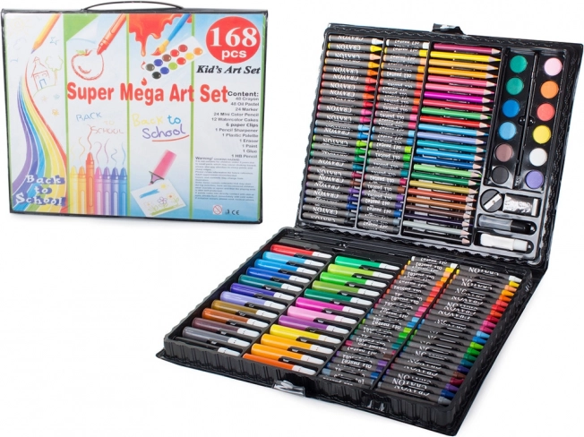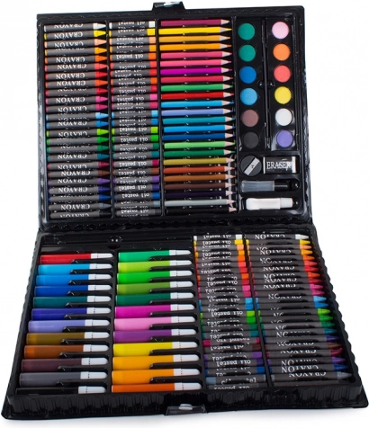От цветни моливи и флумастери до акварелни бои – 168 части за рисуване, оцветяване и живопис, подредени удобно в прегледно куфарче.