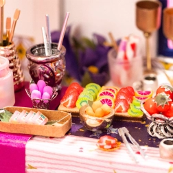 Миниатюрата включва детайлни елементи като цветни столове, маси и други декорации, които правдиво пресъздават реална обстановка.