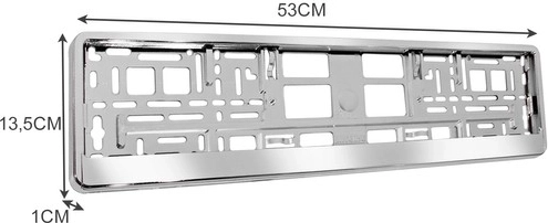 Съдържание на опаковката: 2x рамка за регистрационни номера с размери 53 x 13,5 x 1 cm и тегло 381 g всяка, общо тегло на комплекта 538 g.