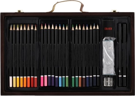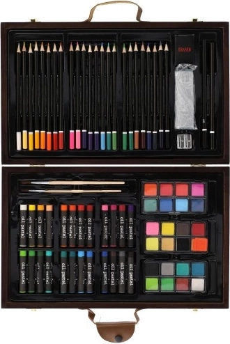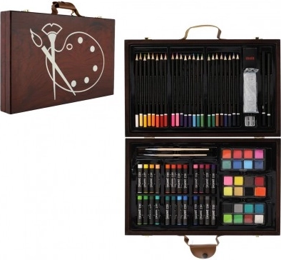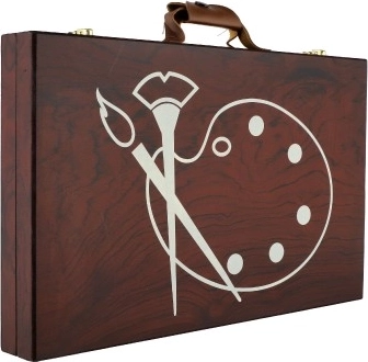 Дървеното куфарче, пълно с цветове и инструменти, е перфектният спътник за младите творци. Съдържа всичко необходимо за рисуване и скициране, в елегантна и лесно преносима опаковка:
