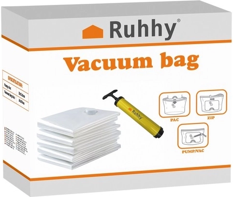 Поддържайте ред у дома и спечелете повече пространство за миг. Вакуумните пликове RUHHY се пълнят лесно, херметически се затварят и след изсмукване на въздуха обемът им намалява до 80%. Вещите остават чисти, сухи и свежи, готови за следваща употреба.