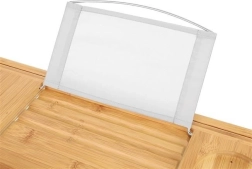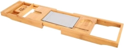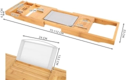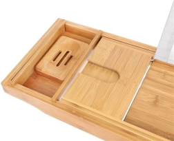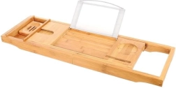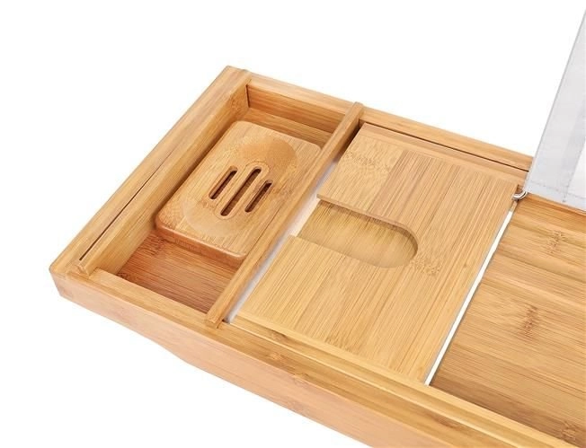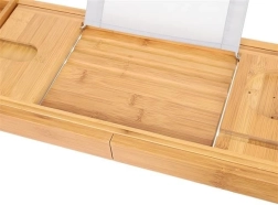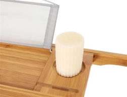 Практичното разпределение предлага стойка за таблет/книга с метална опора и 3 позиции, специален отвор за чаша, подвижна сапунерка и вложка за кърпа, плюс ниша за свещ или аромат. Бамбуковата дървесина е естествено устойчива на влага, лесна за поддръжка и придава елегантен вид в банята.