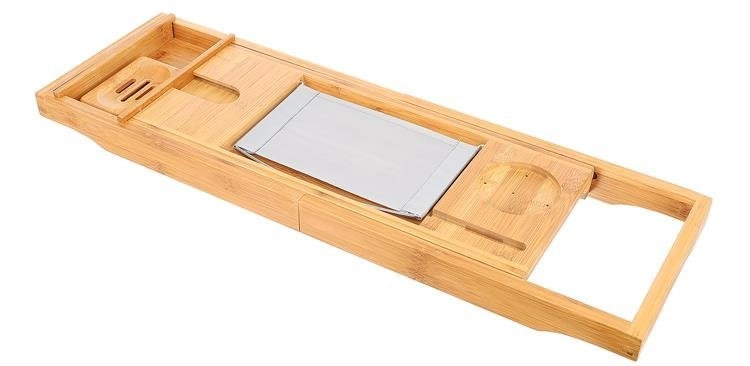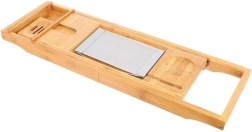 Насладете се на релакс във ваната със стилната бамбукова етажерка, която предлага разтегаема дължина, стойка за книга или таблет с 3 ъгъла на наклон, място за чаша вино, сапунерка, подвижна вложка за кърпа и пространство за свещ. Издръжливият бамбук е водоустойчив, съхне бързо и се почиства лесно – идеален за вашето домашно уелнес изживяване.