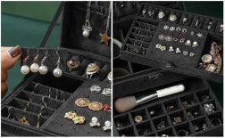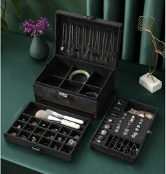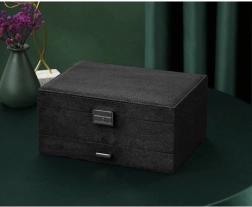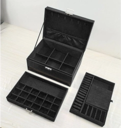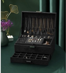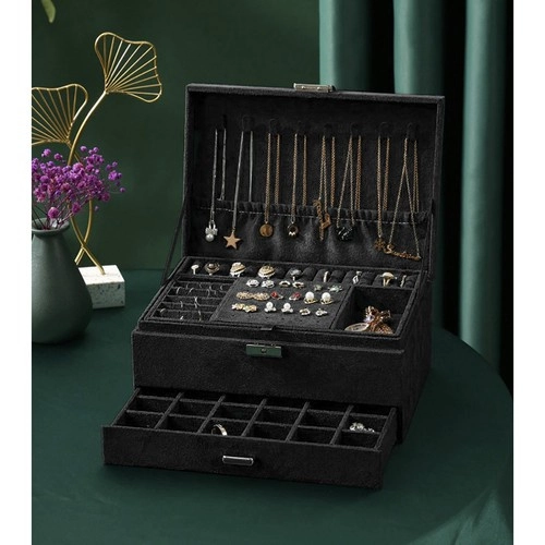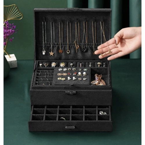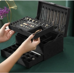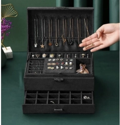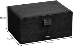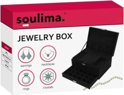 Стилната и практична кутийка за бижута SOULIMA в елегантно черно осигурява перфектно подредено съхранение на бижутата у дома и в пътуване. Има няколко нива и различни отделения за пръстени, обеци, колиета, гривни и часовници, заключване с ключ за по-висока сигурност и мек кадифен завършек, който защитава от надраскване и прах.