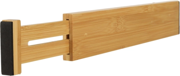 Изживейте перфектната организация с практичния органайзер за чекмедже, който позволява лесно подреждане на всичките ви вещи. Разделете различни продукти дори в едно чекмедже и се насладете на естетичния вид благодарение на бамбуковия материал. Органайзерът е идеален за кухня, баня или гардероб, с регулируема дължина от 34 до 43,5 сантиметра, за да пасне перфектно на вашите чекмеджета.