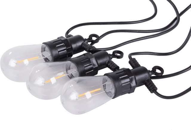 Веригата завършва с плътна свързваща резбова връзка, така че можете лесно да свържете няколко гирлянди и да адаптирате дължината според нуждите си. Прозрачните капаци на крушките са изработени от здрав пластмаса, която е лека и практична за често преместване и сезонна употреба.