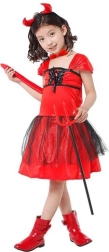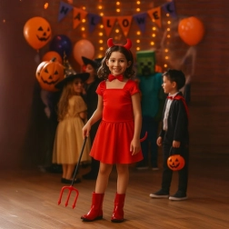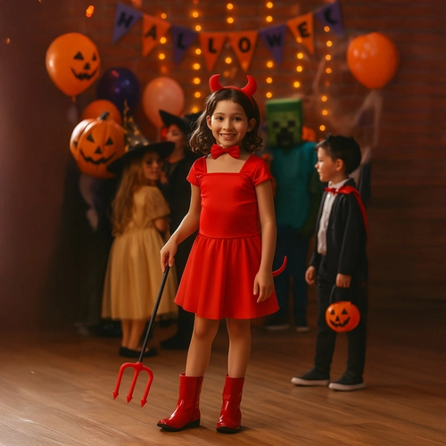 Стилен дяволски костюм в наситено червен цвят, който преобразява всяко дете и възрастен за секунди. Благодарение на меките материали и еластичните захващания аксесоарите се поставят лесно и стоят удобно през цялото забавление. Комплектът е идеален за домашни ролеви игри, училищни тържества, фотосесии и партита.