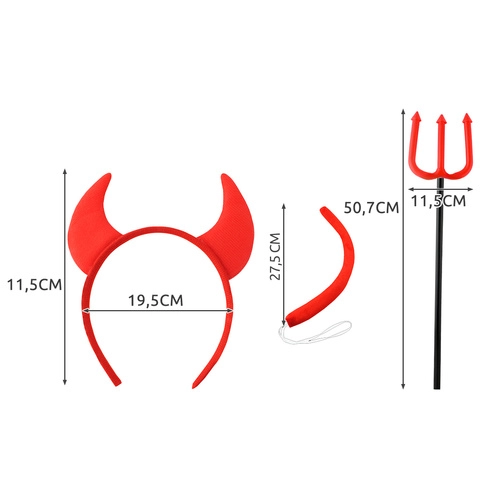 Комплектен костюм на дяволче за деца и възрастни с 4 аксесоара: рога на диадема, папионка, опашка и тризъбец. Универсален размер с еластични ластици за удобно носене. Отличен избор за Хелоуин, карнавал, рожденни партита или тематични събития – създайте за минути ефектен и забавен костюм.