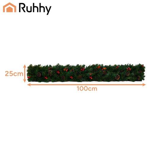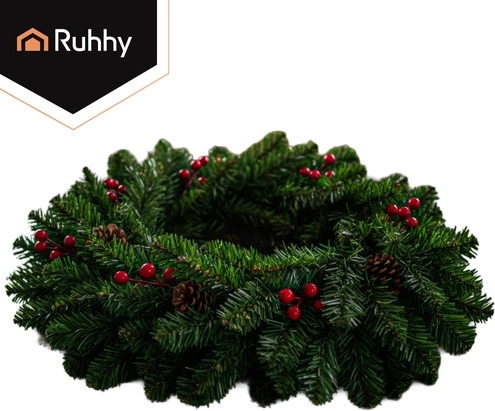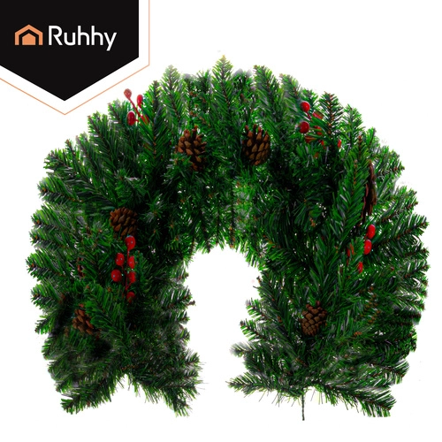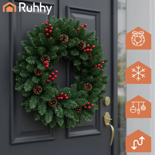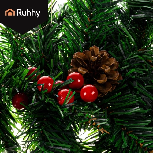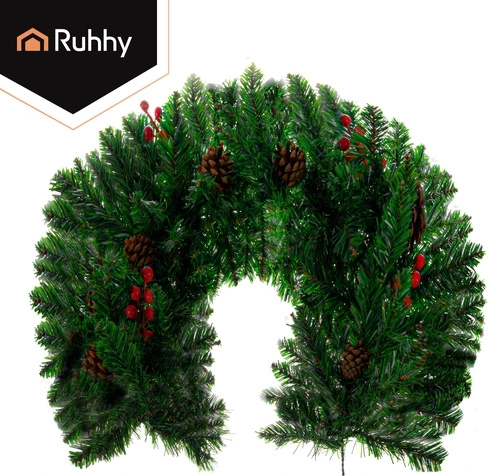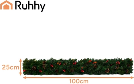 Придайте на дома си празнична атмосфера с декоративната коледна гирлянда Ruhhy с дължина 1 м. Гъстите иглички с реалистичен вид са допълнени от естествено изглеждащи шишарки и червени плодчета. Гирляндата е лека, гъвкава и издръжлива, идеална за врати, парапети, корнизи и тържествени аранжировки както на закрито, така и на открито.
