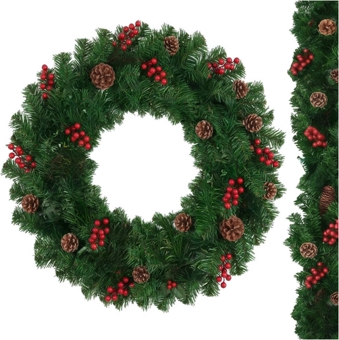 Елегантната комбинация от зелени иглички, червени плодчета и естествено изглеждащи шишарки създава впечатляваща празнична декорация за врати, стени и корнизи.