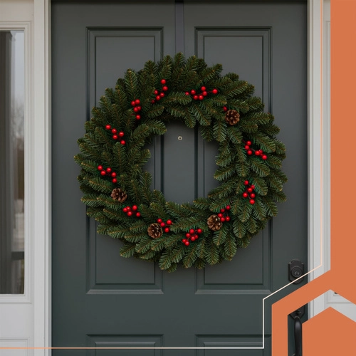 Стилна коледна гирлянда 1 м с гъсти PVC иглички, идеална за декорация на врати, балкони, парапети и колони. Благодарение на пластичността лесно я оформяте според нуждите – от прав лайнер до многослойни кръгови декорации. Интегрираните шишарки и клончета с червени плодчета придават естествен и елегантен акцент.