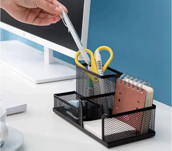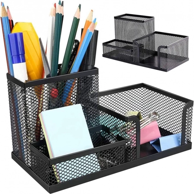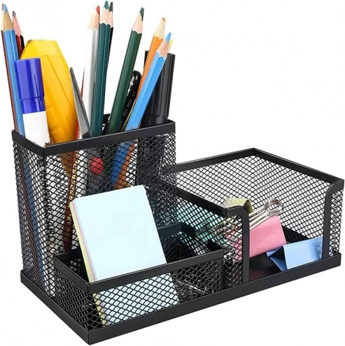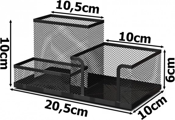 Открийте предимствата на организацията с нашия черен мрежест настолен органайзер. Неговата лека метална конструкция е проектирана така, че работното ви място да остане чисто и ефективно. Трите просторни отделения помагат да подредите всякакви офис принадлежности, което ви позволява да се съсредоточите върху работата и да повишите продуктивността.