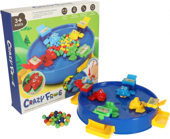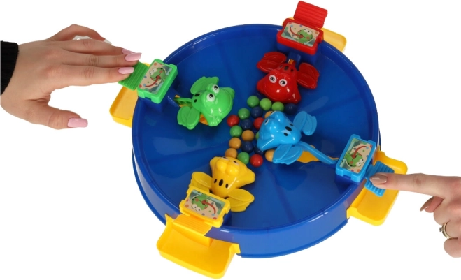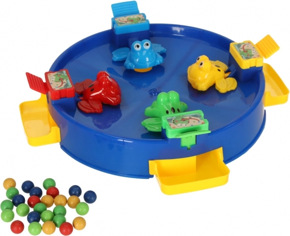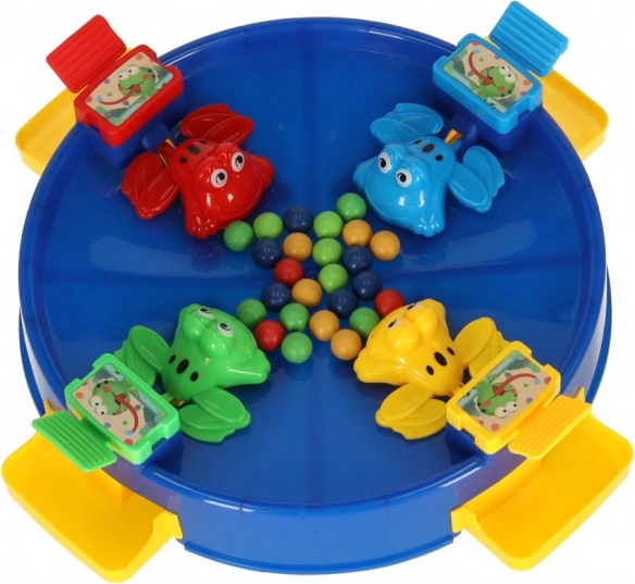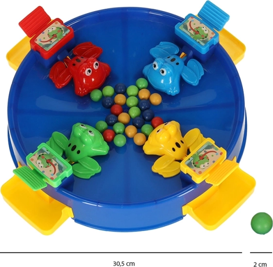 Изживейте уникално забавление със скачащите жабки, в което се включва цялото семейство. Тази игра е предназначена за 2 до 4 играчи, които се състезават да уловят възможно най-много топчета с помощта на цветните жабки, разположени около езерцето. Забавлението започва, когато изсипете топчетата в центъра на играта, а механиката на „поглъщане“ от жабките увлича играчите.