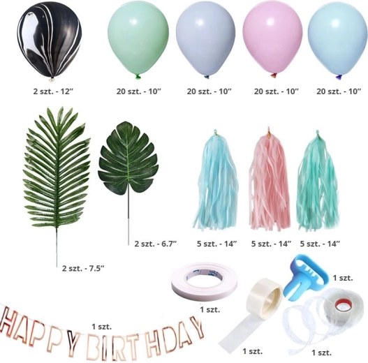 Комплектът осигурява пълна цветна украса за парти за рожден ден само за няколко минути. Включва балони и надпис „Happy Birthday“, с които ще създадете ефектен фото кът и празничен фон за рожденика/рожденичката. Гирляндът се подрежда лесно според нуждите ви и може да бъде разширен с още балони за по-богат вид.