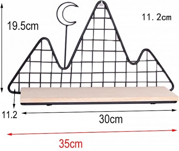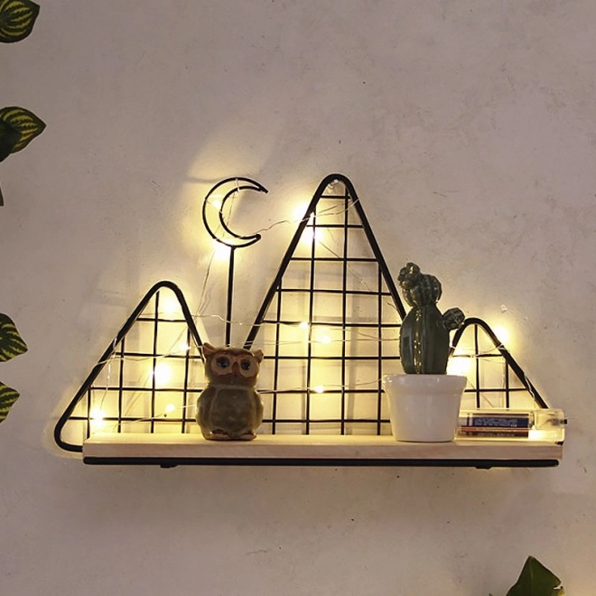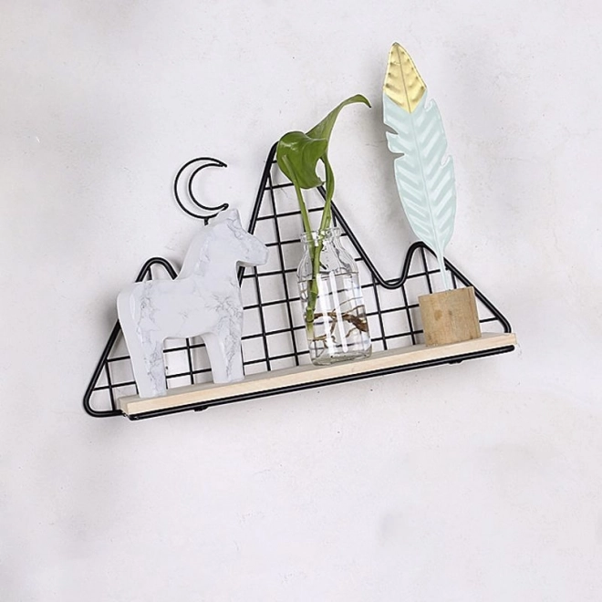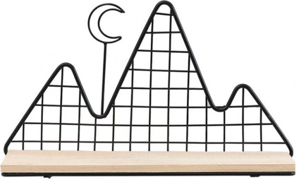Този декоративен рафт в елегантно черно съчетава функционалност и дизайн. Лекият телен корпус с планински мотив изглежда ефирно, докато здравата дървена полица надеждно носи малки декорации, свещи, цветя, рамки или любими книжки.
