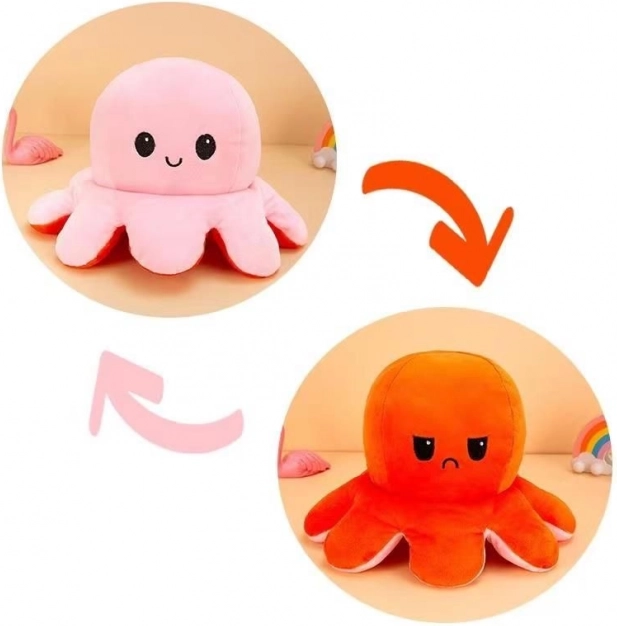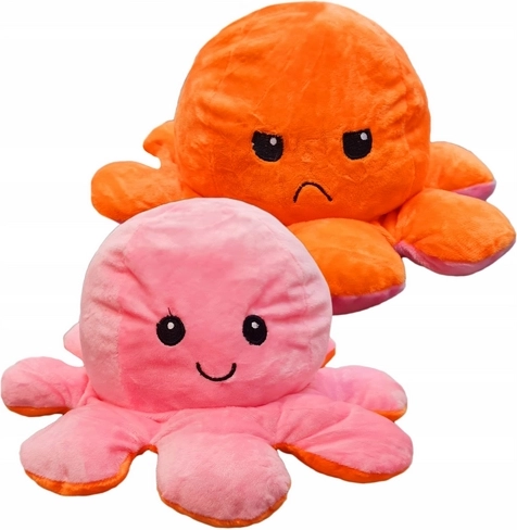 Това двустранно плюшено октоподче е перфектният спътник за деца и възрастни. С едно просто обръщане за секунди превключвате изражението от усмихнато на тъжно или ядосано и едновременно сменяте цвета от розово на оранжево. Мекичкият материал приканва към гушкане и е чудесен като антистрес играчка.