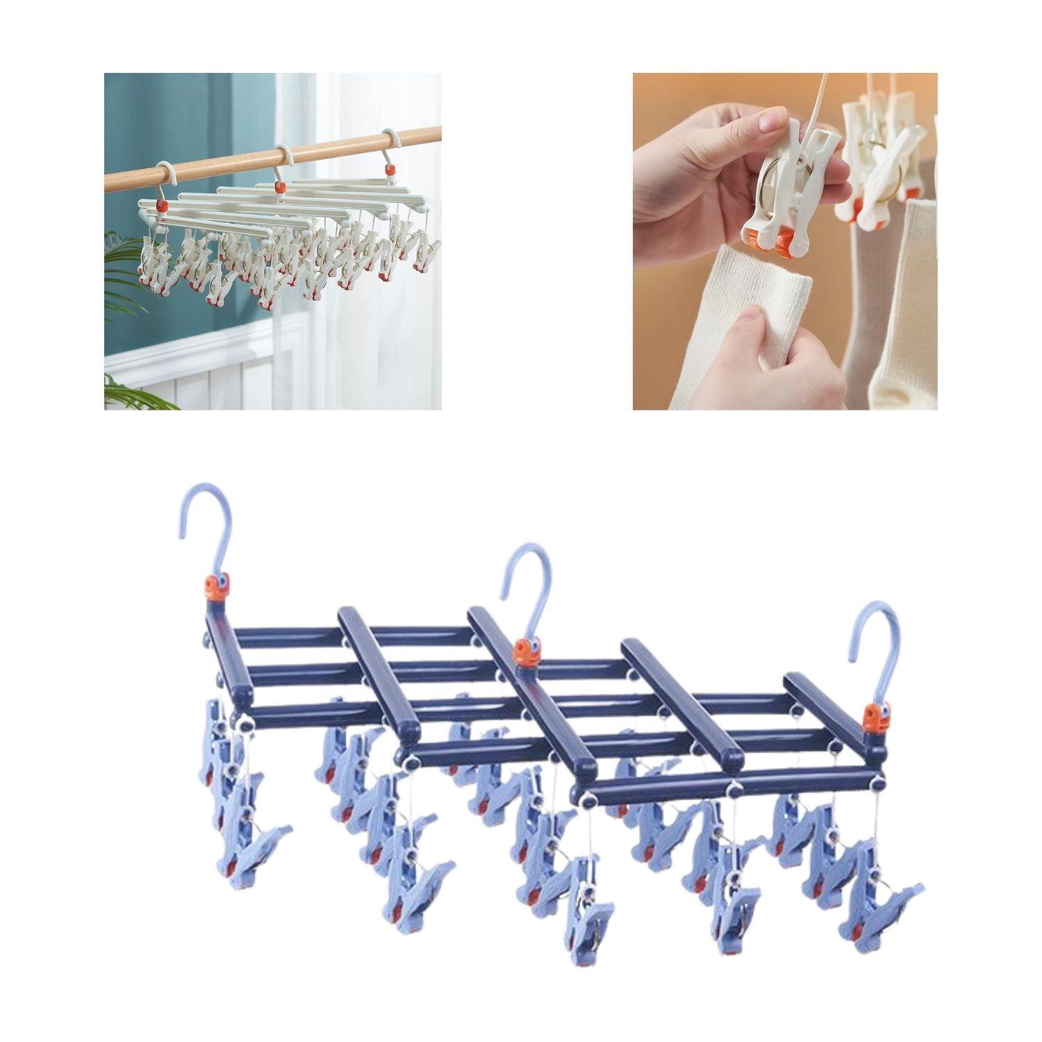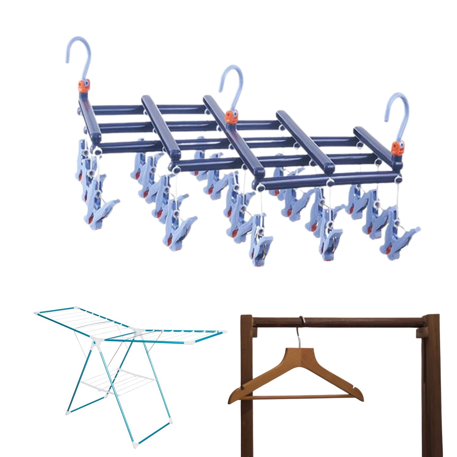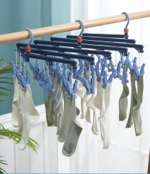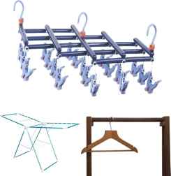 Спестете място и време със сгъваемата сушилка с 19 щипки, която изсушава наведнъж много дребни вещи. Издръжливата пластмаса устоява на влага, щипките с ергономична форма държат здраво и не увреждат тъканите. Въртящият се кукич със заключване позволява закачане практически навсякъде – на прът, въже или класическа стойка.
