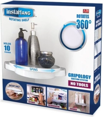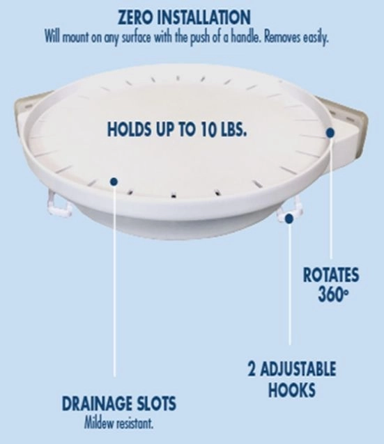 Етажерката се върти на 360°, така че бързо ще намерите това, което ви трябва. Монтажът е въпрос на минути – без пробиване и инструменти, достатъчно е да натиснете притискващата дръжка и да я поставите там, където искате да използвате всеки сантиметър пространство. Вградените куки осигуряват допълнително място за окачване на кърпи, кухненски кърпи или гъби за баня.