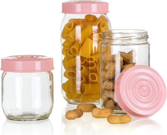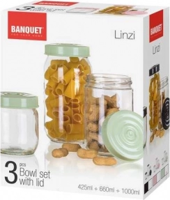 Практичен комплект от три стъклени буркана LINZI с обеми 425 ml, 660 ml и 1000 ml за прегледно съхранение на храни. Стъклените тела с пластмасови капаци в розов цвят осигуряват плътно затваряне и по-дълга свежест на съдържанието – идеални за паста, захар, ядки или подправки. Качество и стил от марката BANQUET за всяка кухня.