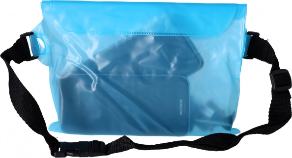 Практична и стилна водоустойчива чантичка в светлосин цвят, която предпазва телефона, документите, ключовете и парите ви от вода и пясък. Благодарение на прозрачния материал позволява управление на сензорния екран, има регулируема презрамка и сигурно закопчаване с велкро. Идеална за плаж, басейн и водни спортове.
