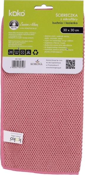 Практичната микрофибърна кърпа KOKO с размер 30×30 см е идеална за ежедневното почистване в кухнята и банята. Без следи и надрасквания почиства и полира вани, плочки, мивки и умивалници. Може да се използва многократно, щадяща е към околната среда и благодарение на микрофибъра ефективно почиства и без почистващи препарати. Лесна поддръжка чрез пране в пералня.