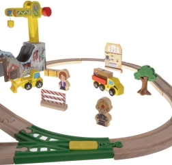 Тази богато оборудвана дървена железопътна линия носи на децата часове творческа игра. Частите са гладко обработени и боядисани с безопасни бои. Влаковите композиции се свързват със силни магнити, така че остават стабилни дори при повдигане. Комплектът включва кран, мостове, пътни знаци, дървета, сгради и работни автомобили – всичко необходимо за пъстри сцени.