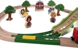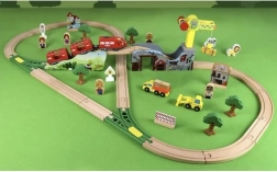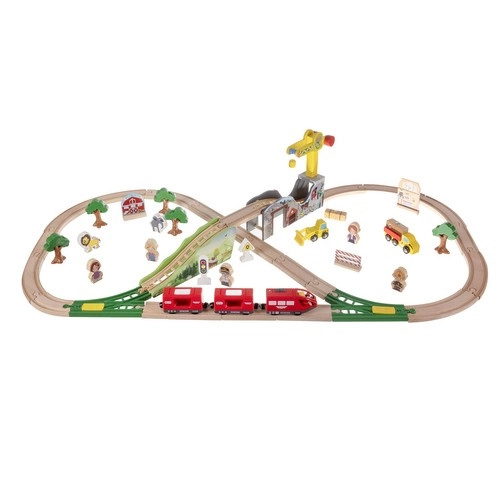 • Голям комплект от 57 части: релси включително мостове, пътнически влак, кран, фигурки, дървета, сгради, животни и работни превозни средства.