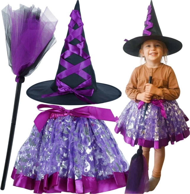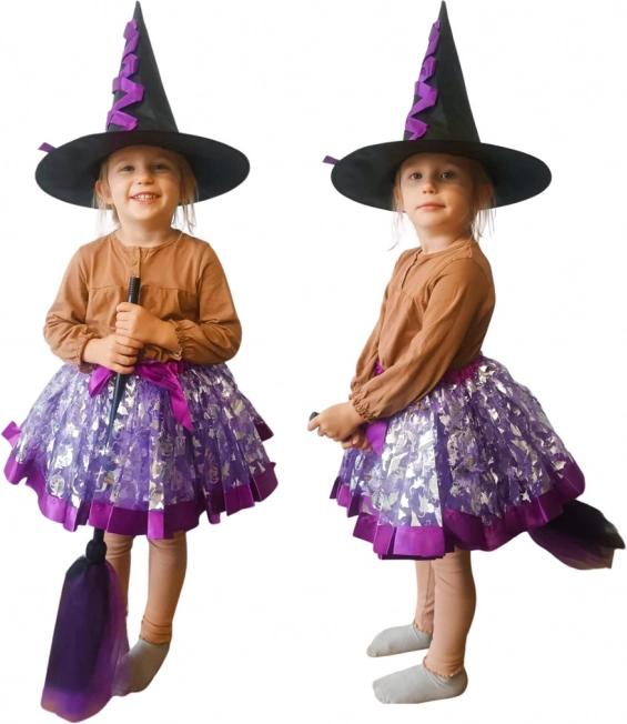 Облечете детето си в този очарователен комплект вещерски костюм, който включва декоративна шапка, лилава пола с еластичен колан и уникална метла. Този костюм е идеален за училищни карнавали, тематични събития или за ежедневна игра у дома.