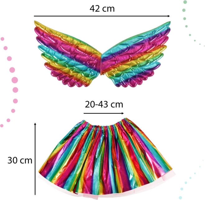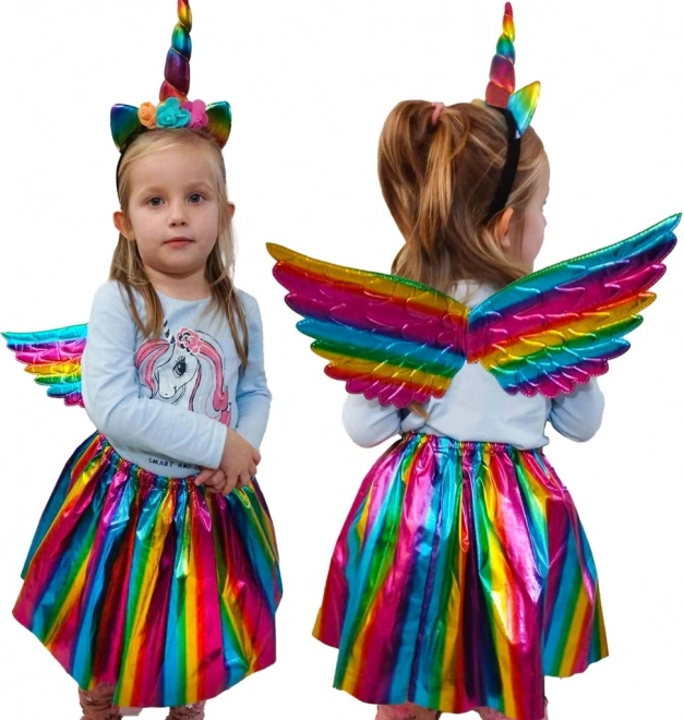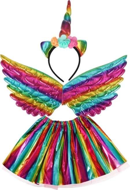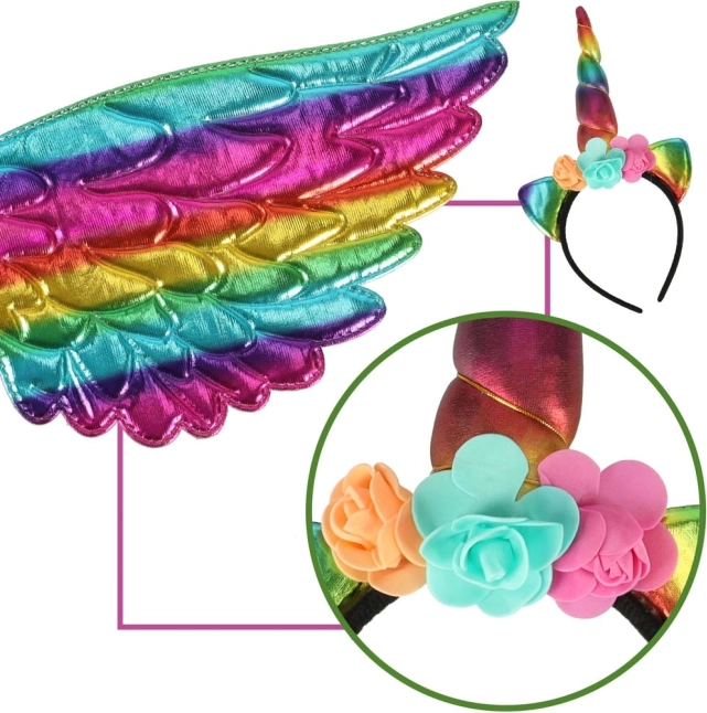 В опаковката ще откриете всичко необходимо – дъгови крила, диадема с рог и пола, идеални за всякакви празненства.