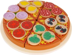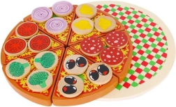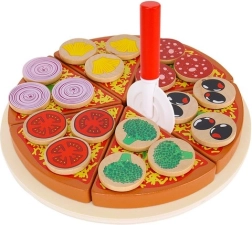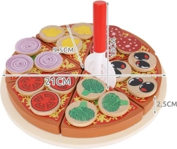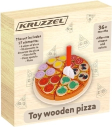 Дървената пица със сух цип е креативна играчка, която позволява на малките деца да „приготвят“ пица с разнообразни съставки. В комплекта ще откриете 27 части, включително основа, 6 парчета пица, лопатка, нож и 18 различни зеленчукови съставки. Благодарение на качественото дърво и безопасните бои играчката е не само забавна, но и безопасна. Включени са лепенки (велкро), които позволяват да се прикрепят съставките и да се „реже“ пицата, като така се развиват координацията и логическото мислене.