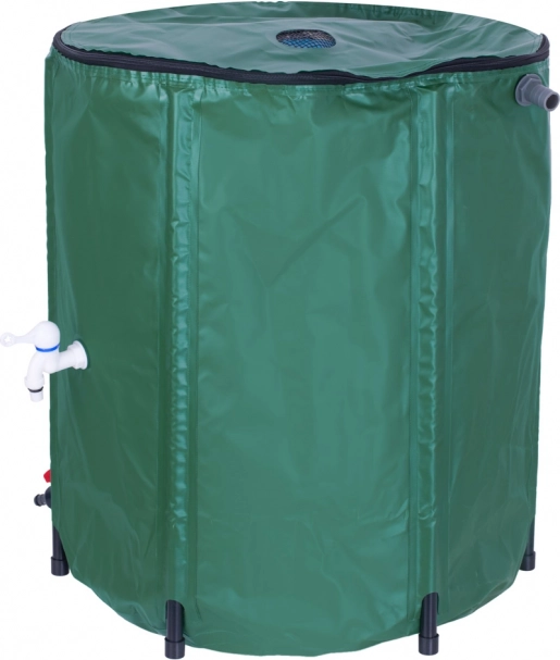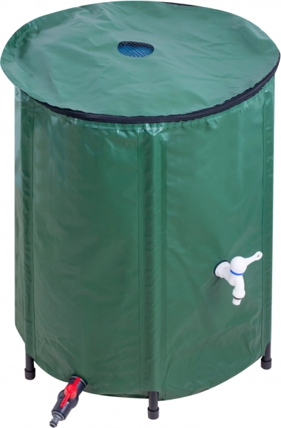 Използвайте безплатно достъпната дъждовна вода за поливане на градината, тревните площи или за миене на външни повърхности и така намалете разхода на питейна вода от водопровода. Сгъваемият резервоар с обем 500 л е изработен от висококачествено PVC, устойчиво на UV лъчи и износване. Горният капак с двоен цип и фина мрежа пропуска само водата и задържа листа и замърсявания.