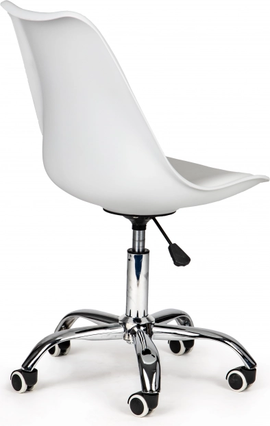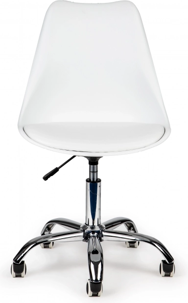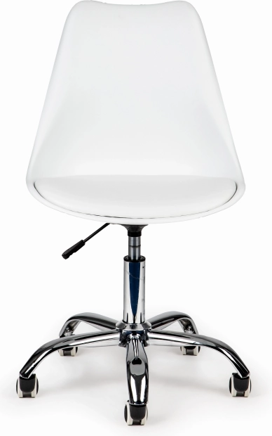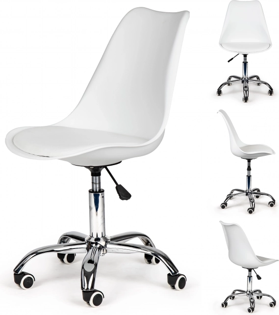 Елегантният въртящ се офис стол ModernHome комбинира регулируема височина с газов амортисьор, висока облегалка и мека бяла възглавница от еко кожа за целодневен комфорт. Стабилната хромирана основа с гумени колела осигурява плавно движение и защита на пода – идеален за модерния офис и домашния кабинет.