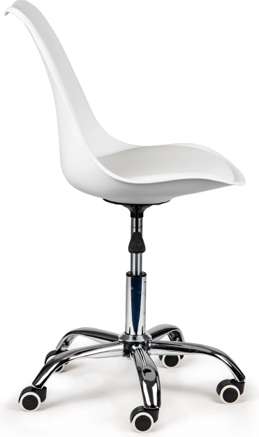 Минималистичният бял дизайн с хромирани елементи е подходящ за рецепции, салони и домашни кабинети. Гумените колела се движат тихо и щадят пода, за да се концентрирате върху работата без разсейване.