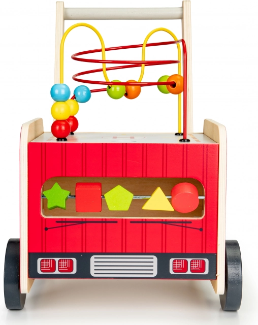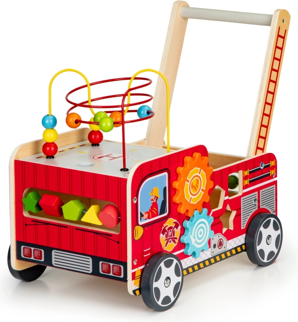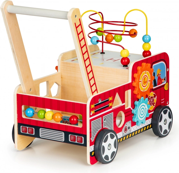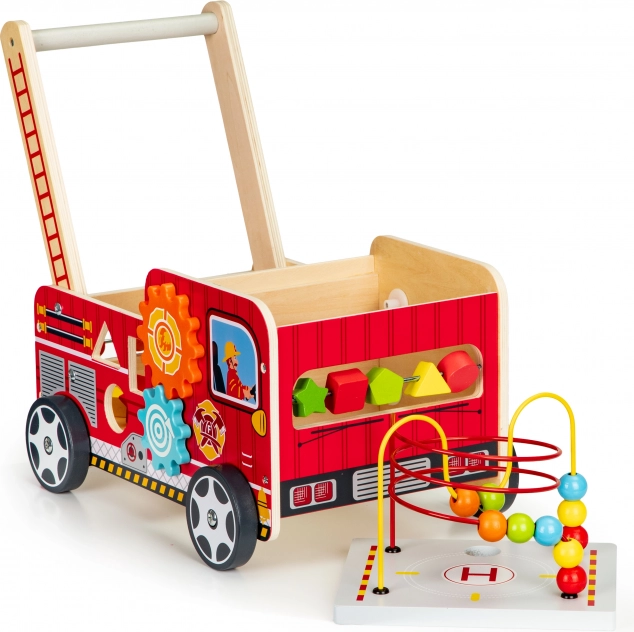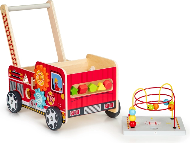 Дървената проходилка във форма на пожарна кола е идеален помощник за първите стъпки на вашето дете. Проходилката е проектирана да осигурява стабилност и същевременно забавление чрез различни интерактивни елементи като зъбни колела, лабиринти с мъниста и сортер на форми.