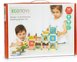 Дървеният конструктор от ECOTOYS развива детското въображение и сръчност със 128 пъстри блокчета и мотиви на герои, автомобили и дървета.